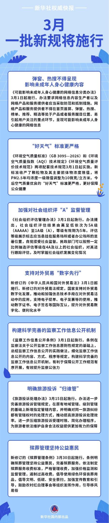 首页首屏、弹窗热搜等不得呈现影响未成年人身心健康的网络信息;“好天气”标准更严格,更好保障公众健康;加强对社会组织评“A”监督管理……3月,一批新规将施行,一起来看!