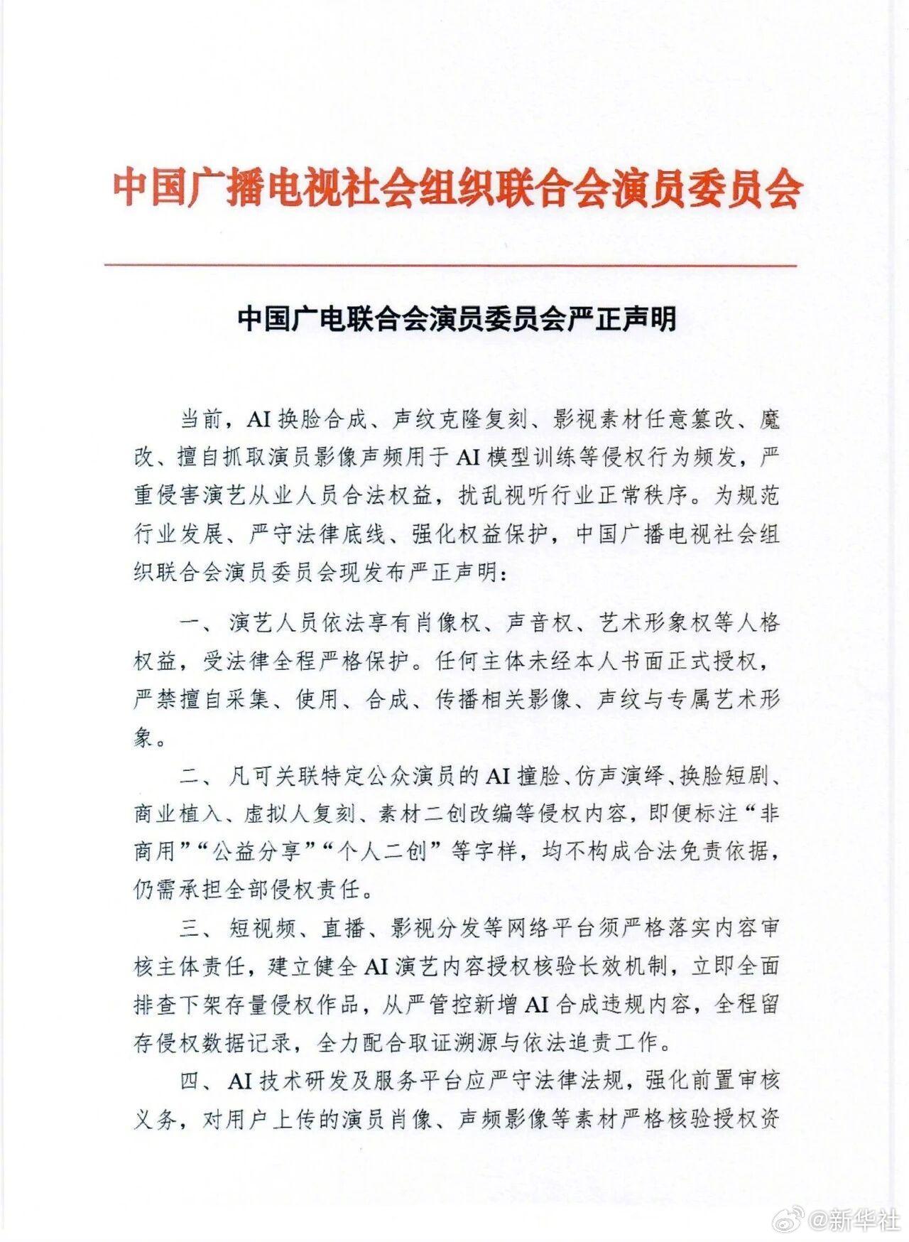 当前,AI换脸合成、声纹克隆复刻、影视素材任意篡改、魔改、擅自抓取演员影像声频用于AI模型训练等侵权行为频发,严重侵害演艺从业人员合法权益,扰乱视听行业正常秩序。为规范行业发展、严守法律底线、强化权益保护,中国广播电视社会组织联合会演员委员会现发布严正声明。(中国广电联合会演员委员会)