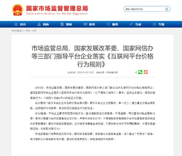 4月8日,市场监管总局、国家发展改革委、国家网信办等三部门联合召开互联网平台价格合规指导会,指导互联网平台企业落实《互联网平台价格行为规则》(以下简称《规则》)要求,压实主体责任,规范价格竞争行为。《规则》将自4月10日起正式实施。