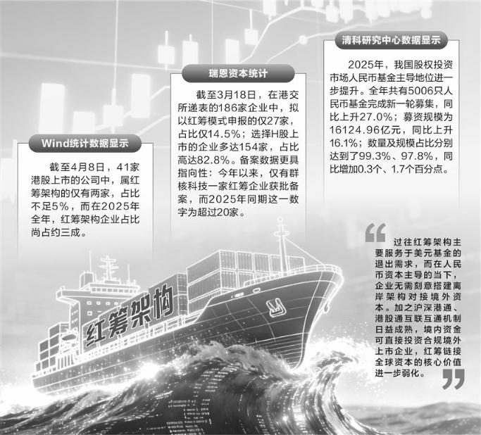 今年以来,曾是中国新经济企业境外上市标配的红筹架构明显降温。Wind统计数据显示,截至4月8日,41家港股上市的公司中,属红筹架构的仅有两家,占比不足5%。而在2025年,这一比例尚有约三成。