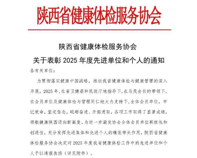 近日,陕西省健康体检服务协会发布《关于表彰2025年度先进单位和个人的通知》,榆林市星元医院健康管理中心荣获“2025年度健康管理先进单位”称号。
