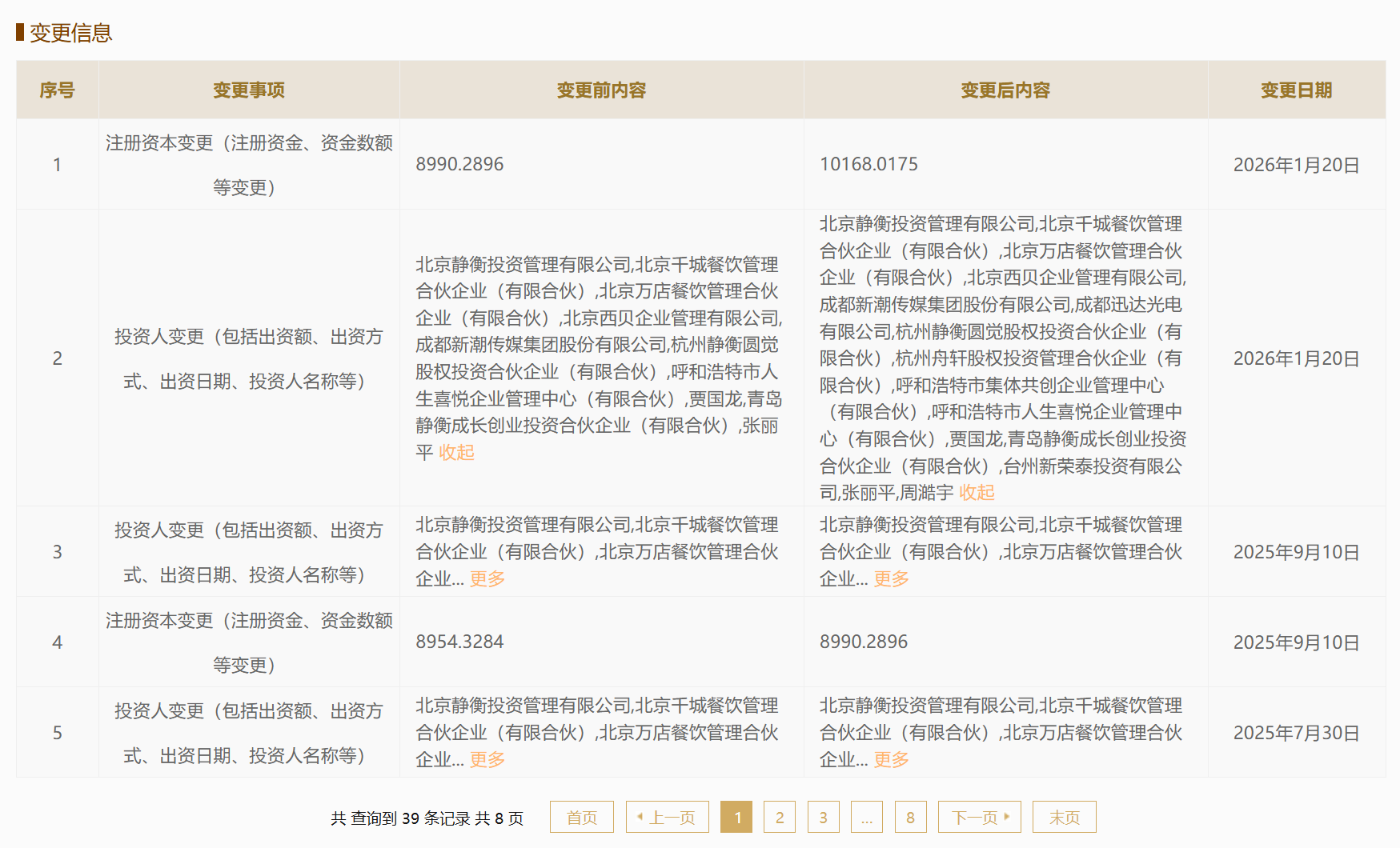 据国家企业信用信息公示系统显示,1月20日,内蒙古西贝餐饮集团有限公司发生工商变更,新增投资方包括台州新荣泰投资有限公司、呼和浩特市集体共创企业管理中心(有限合伙)、杭州舟轩股权投资管理合伙企业(有限合伙)、周澔宇、成都迅达光电有限公司。同时,注册资本由约8990.3万元增至约1.02亿元,增幅约13%。