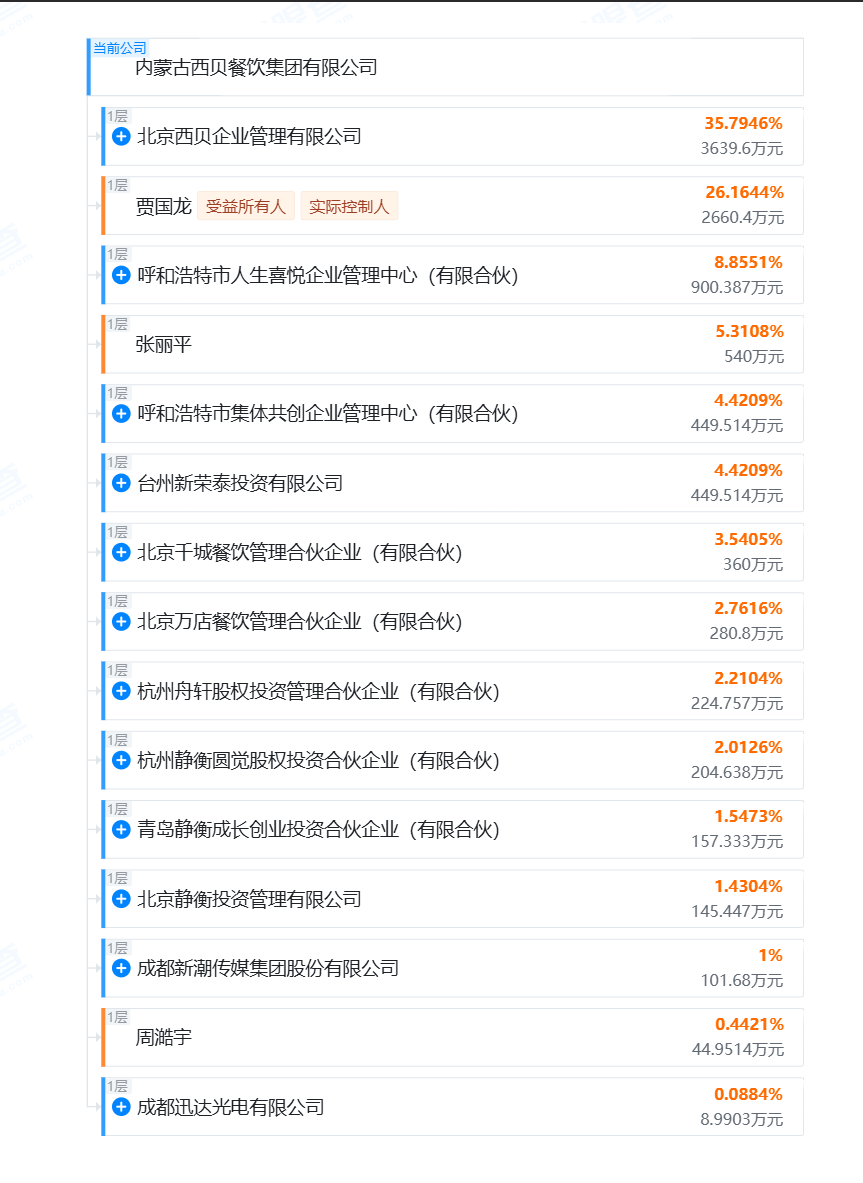 而在本次变更之前,北京西贝企业管理有限公司持股比例为40.5249%,贾国龙持股比例为29.8909%。值得留意的是,北京西贝企业管理有限公司由贾国龙实际控股,持股比例为85%、其妻子张丽平持股比例为15%。